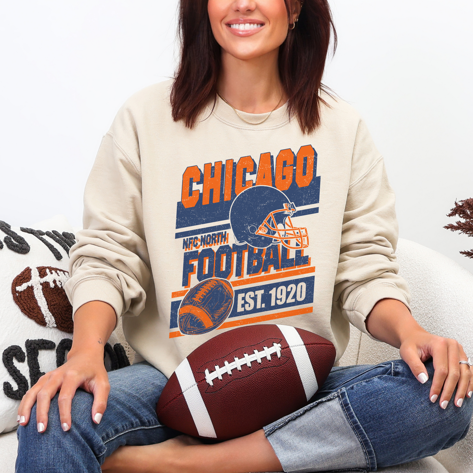 Rep your team with retro flair in our Chicago Football Crewneck Sweatshirt. Featuring bold distressed lettering, a classic helmet graphic, and football illustration, this design celebrates Chicago’s storied football legacy since 1920. The soft cotton-blend fleece and relaxed unisex fit make it perfect for game days, tailgates, or casual weekends. Available in multiple neutral shades, it pairs easily with jeans or joggers for a laid-back yet spirited look.