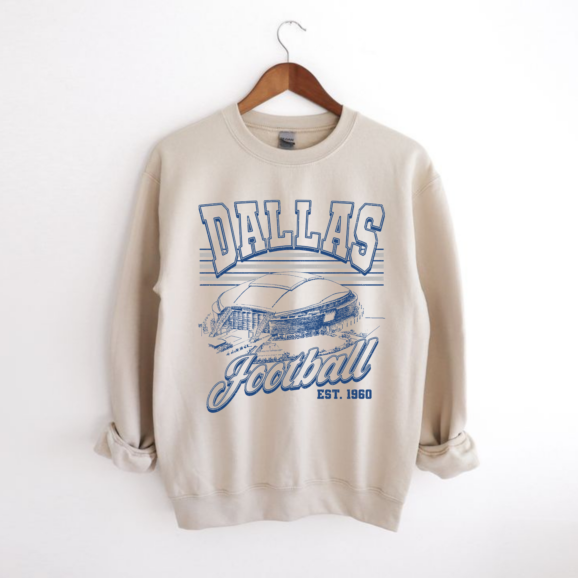 Show your team spirit in vintage style with our Dallas Football Crewneck Sweatshirt. Featuring a hand-drawn stadium illustration and bold retro lettering, this cozy unisex pullover celebrates Dallas football history since 1960. The relaxed fit, soft cotton-blend fleece, and neutral sand color make it perfect for game days, casual outings, or lounging at home. Layer it up for cooler weather or wear it solo for a laid-back look that still scores big on style.