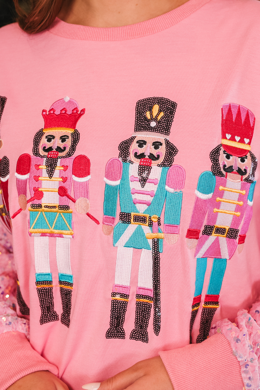 Get into the holiday spirit with our Season To Sparkle Sequin Top! Adorned with nutcrackers and pink sequin sleeves, this top is perfect for all your Christmas parties. Stand out and spread holiday cheer with this sparkling addition to your wardrobe.