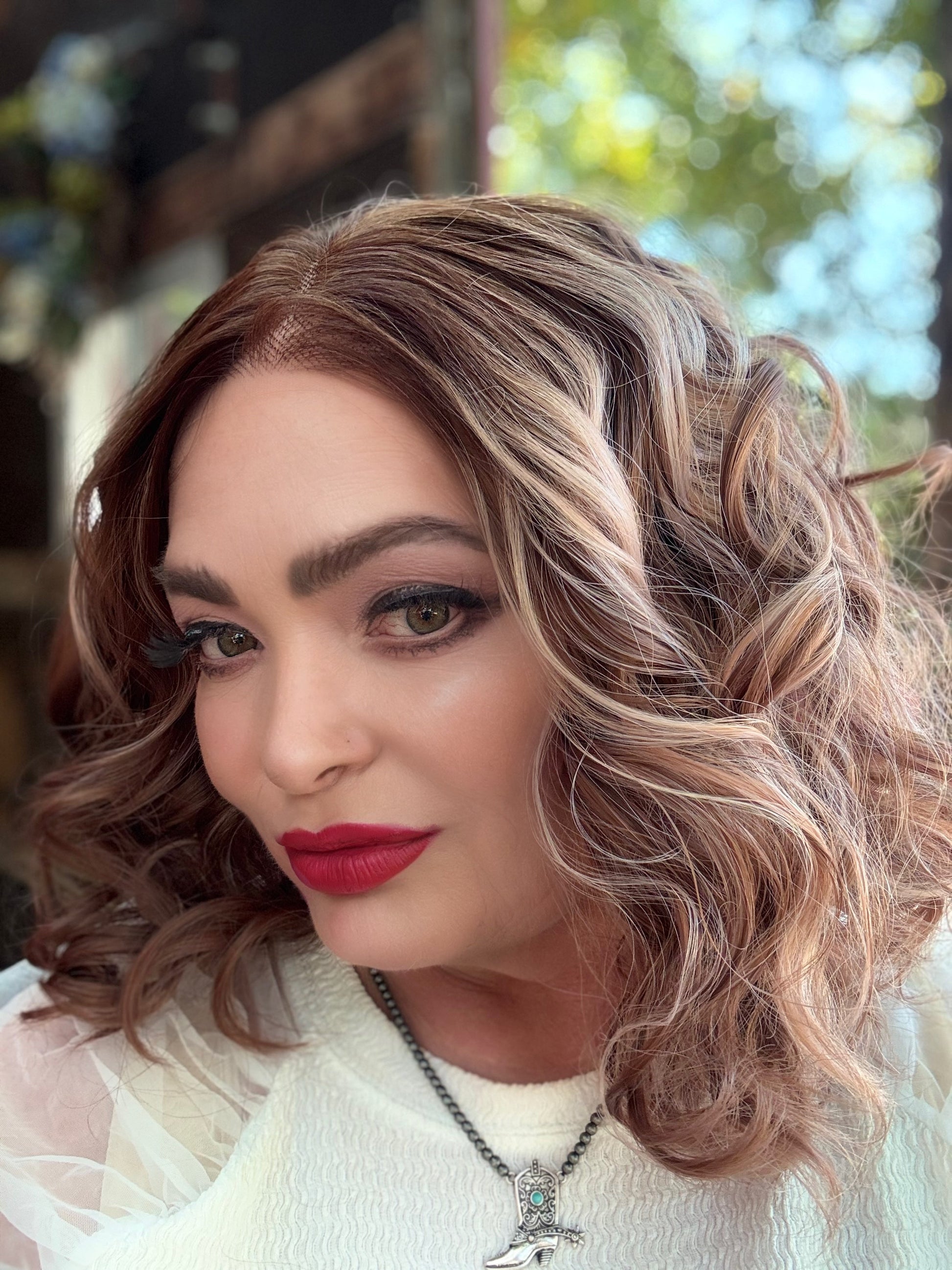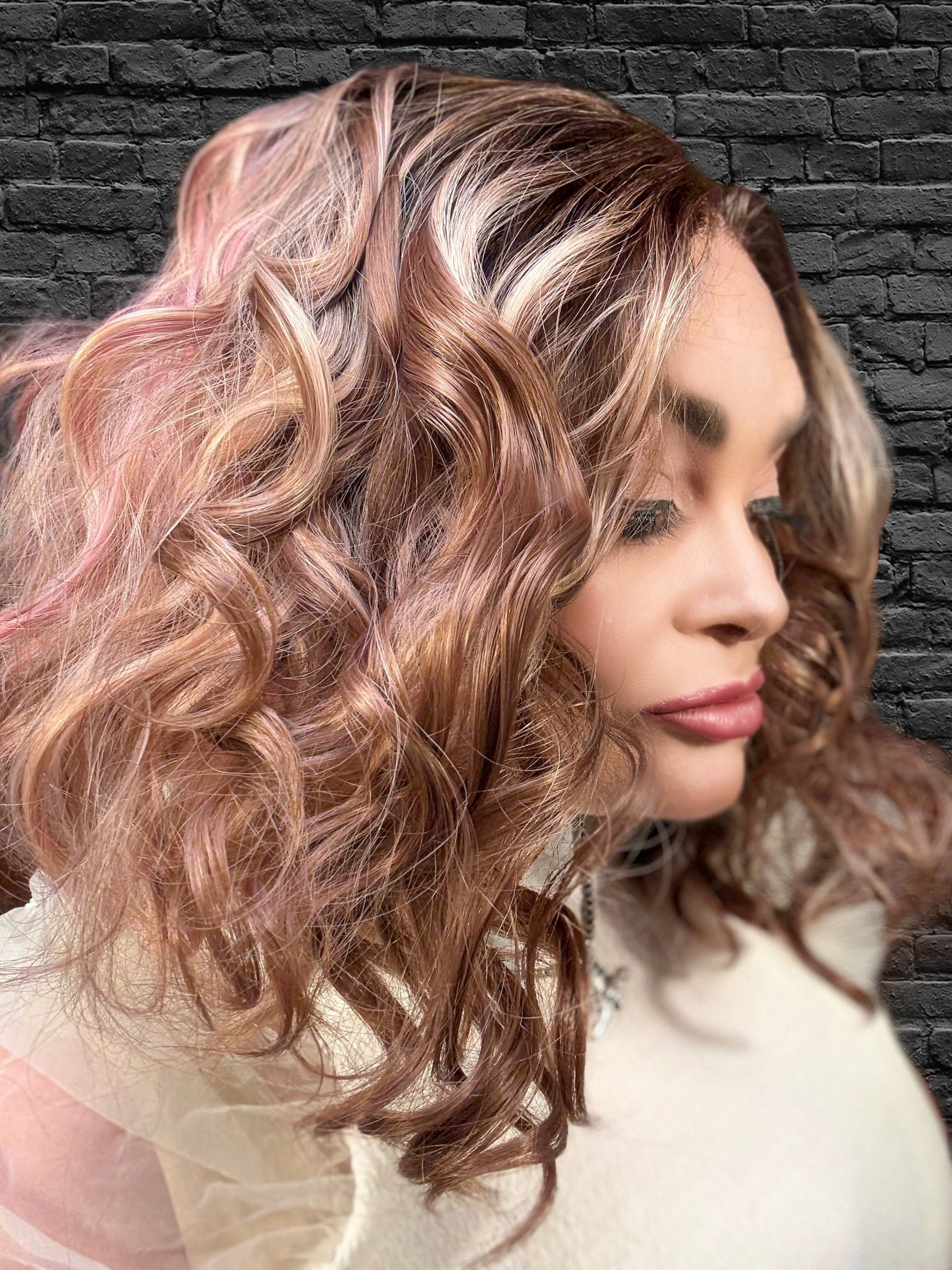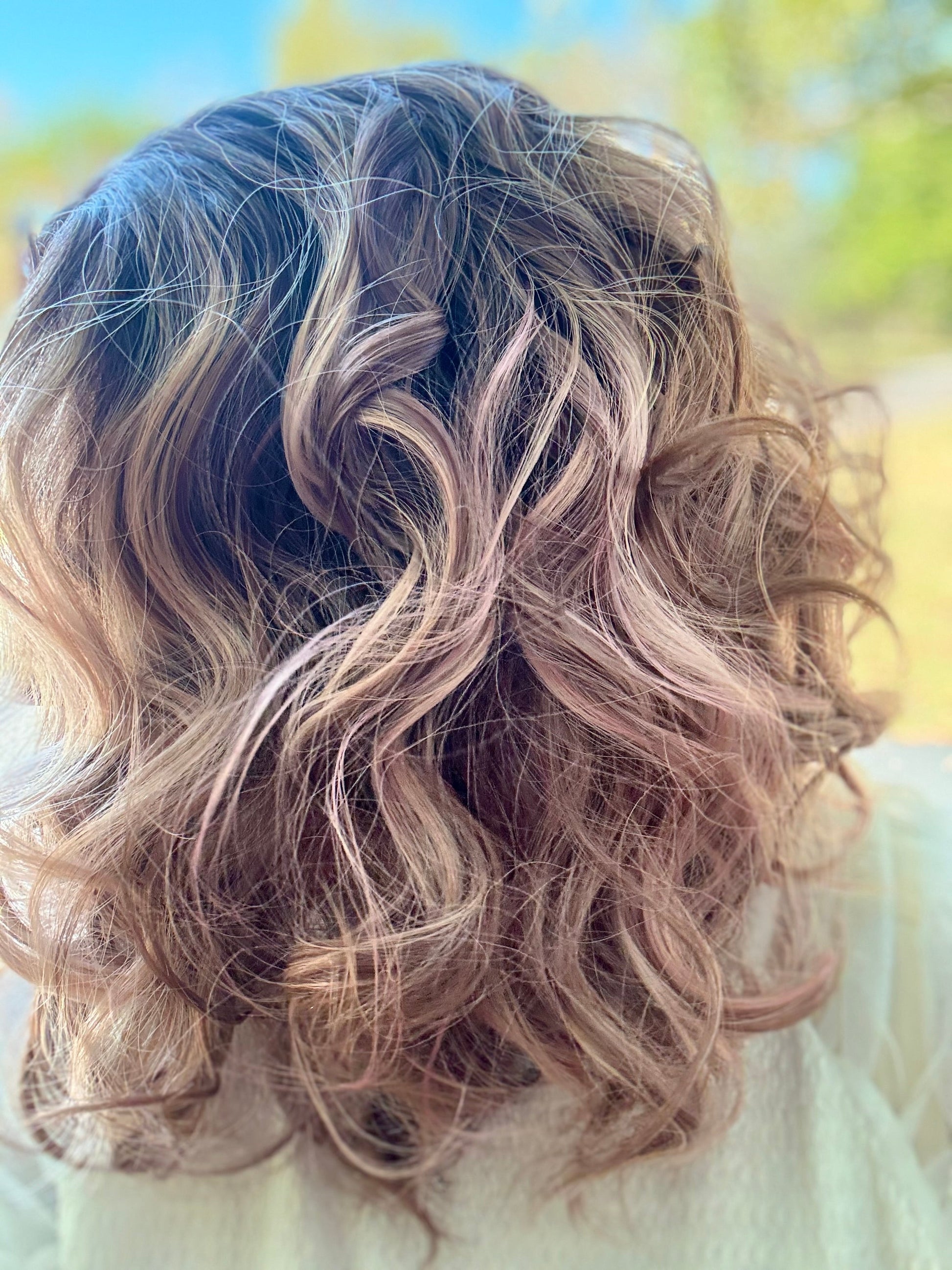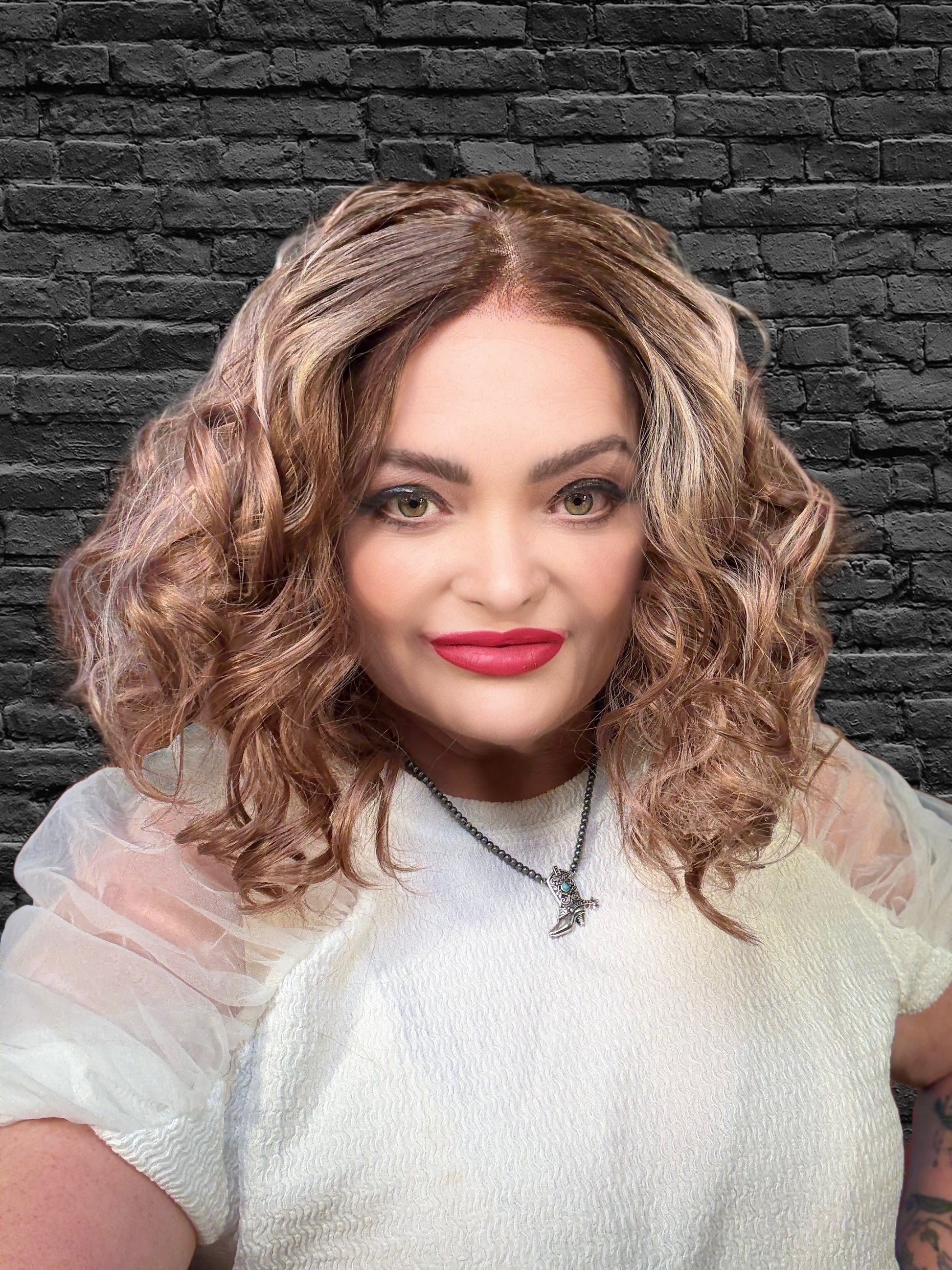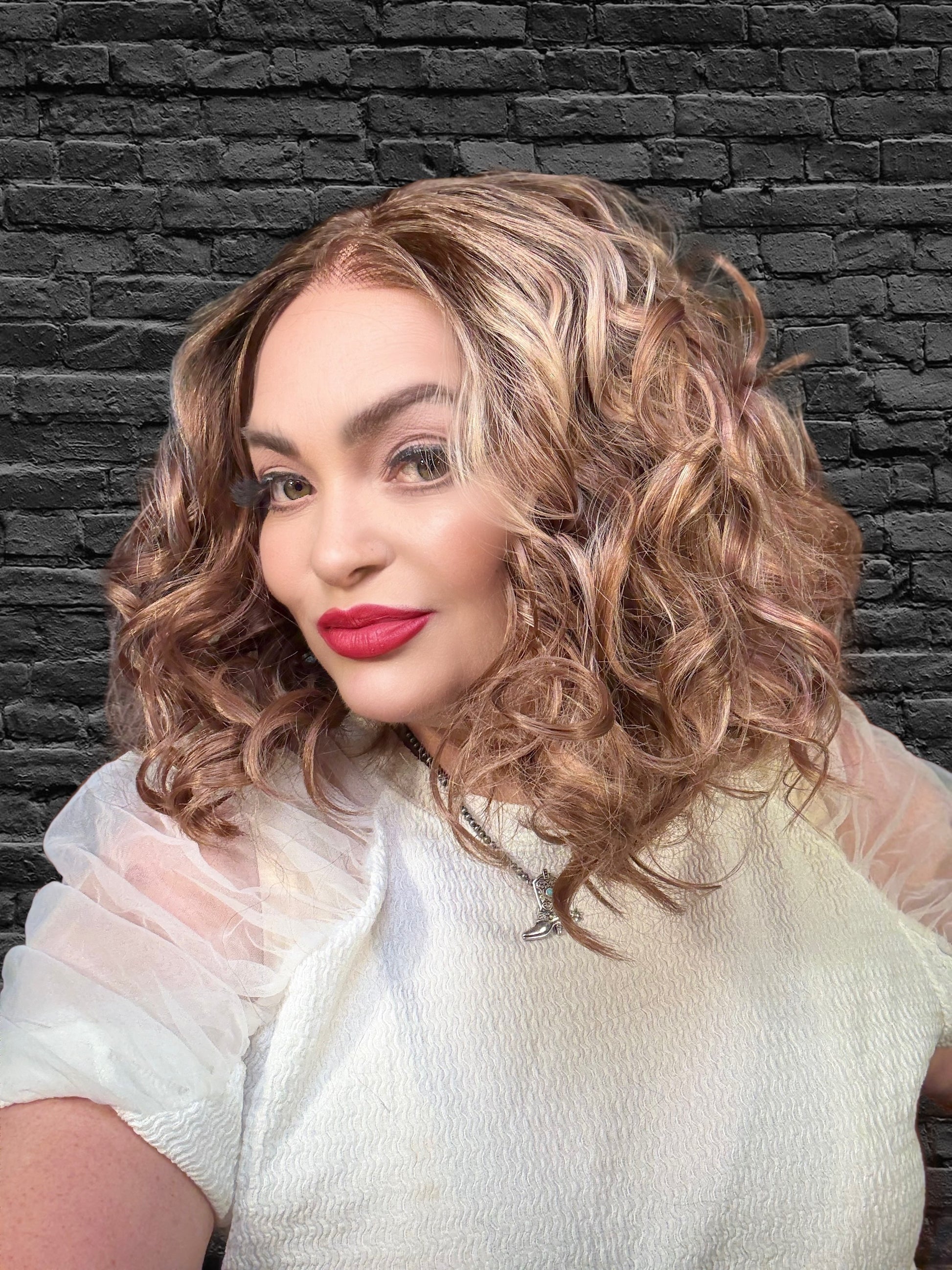 With stunning apricot coloring and plum low lights, SIESTA is a 14-inch synthetic lace front wig that features a free part and adjustable straps for a comfortable fit. Made with premium heat-resistant fibers, it offers versatile styling options for a natural look. Its loose curls and rooted design add extra volume and body.