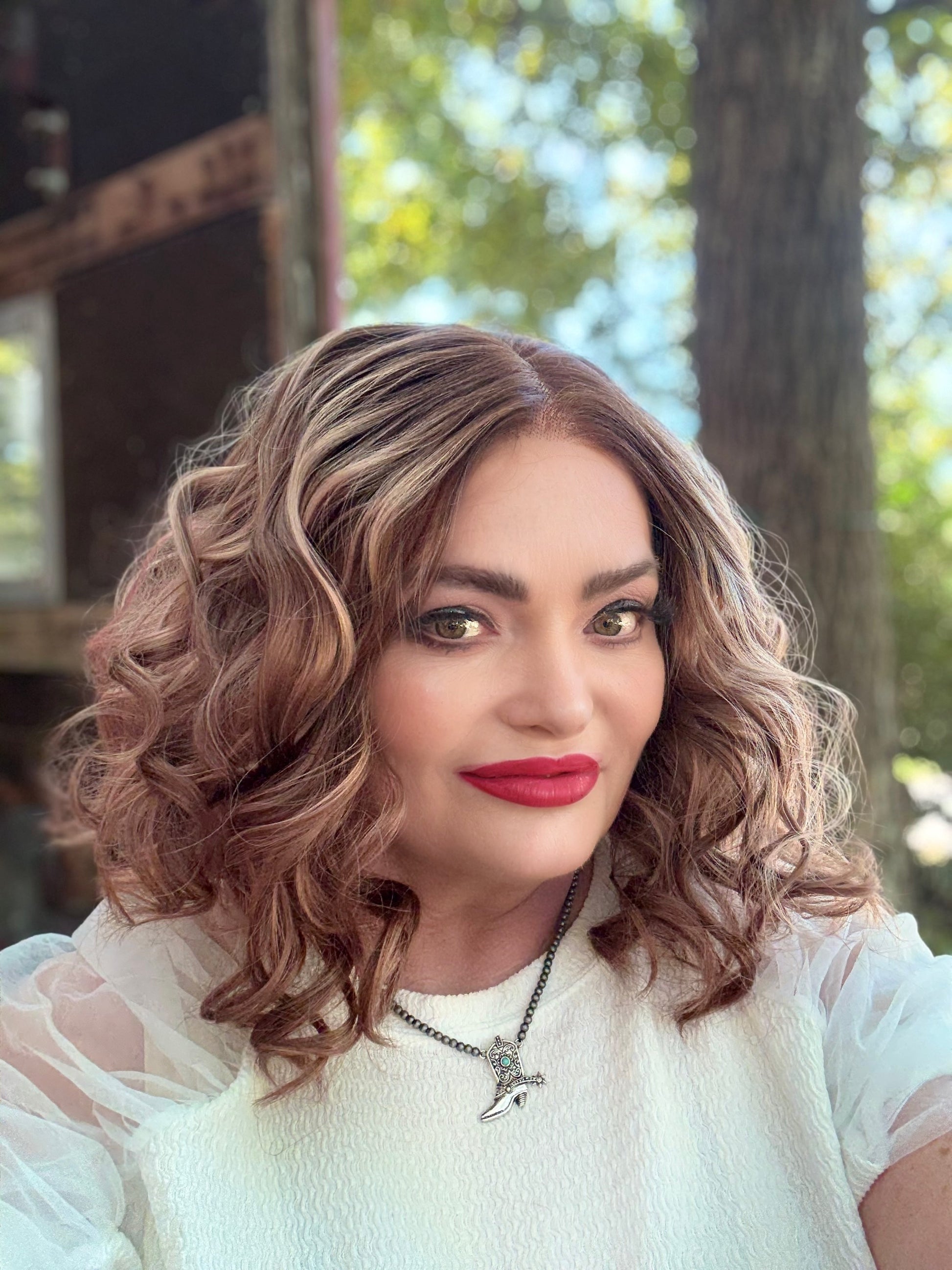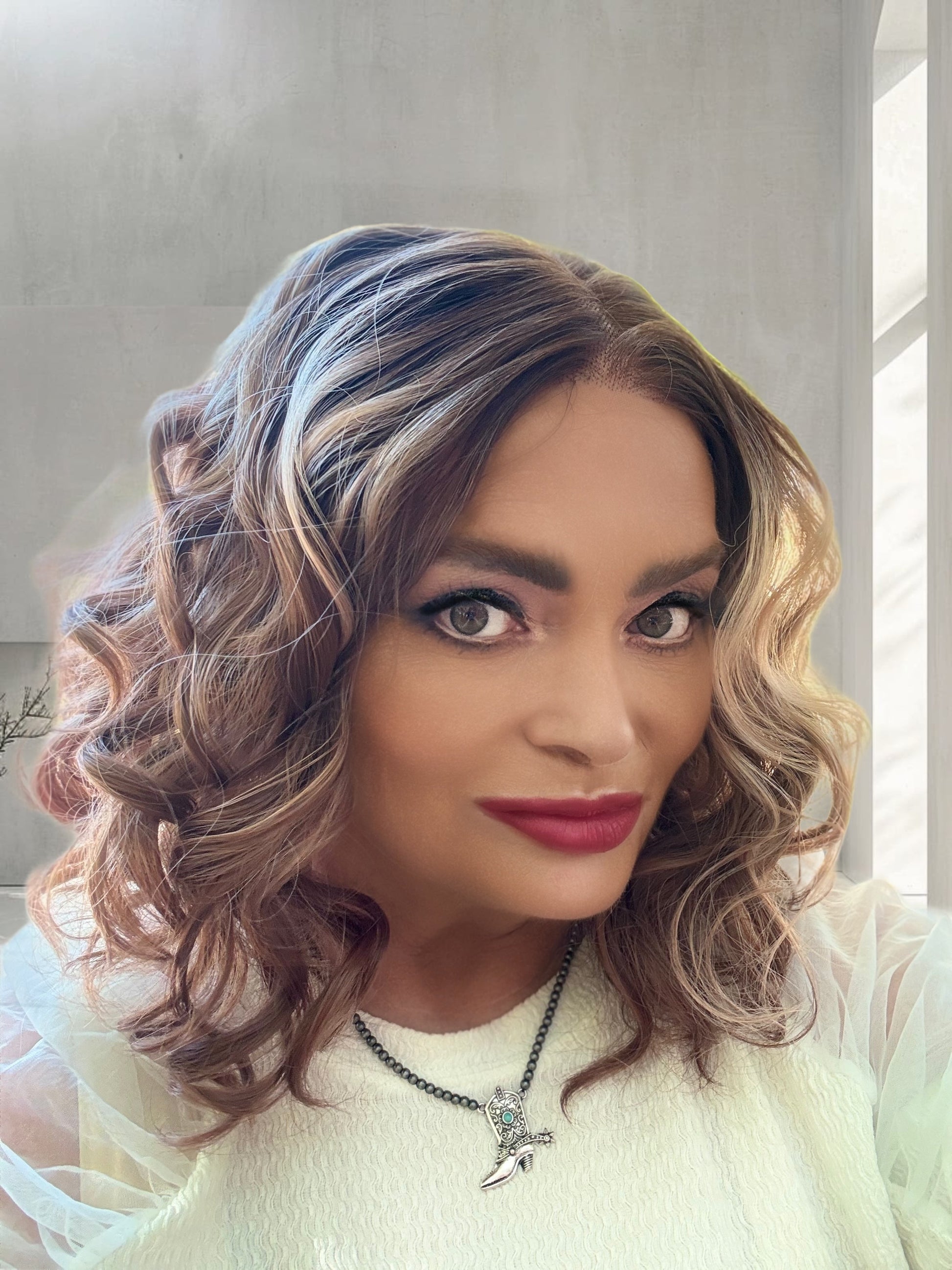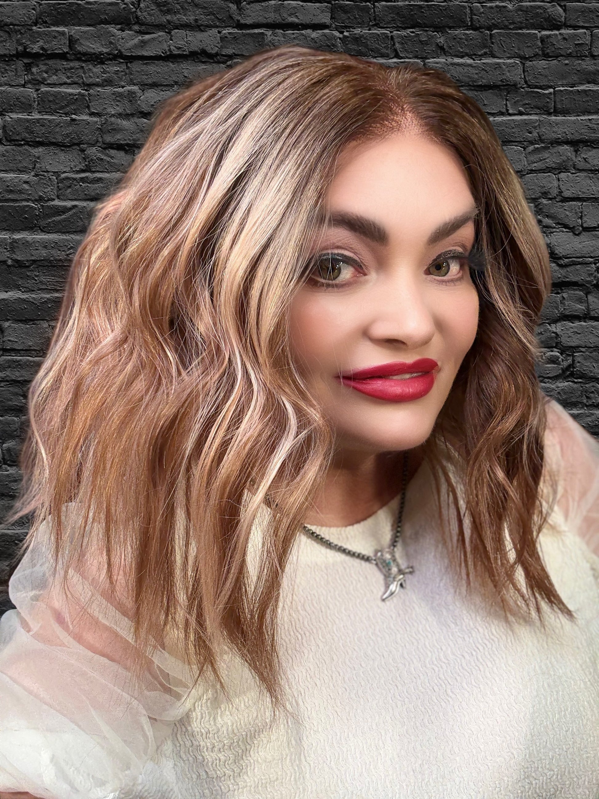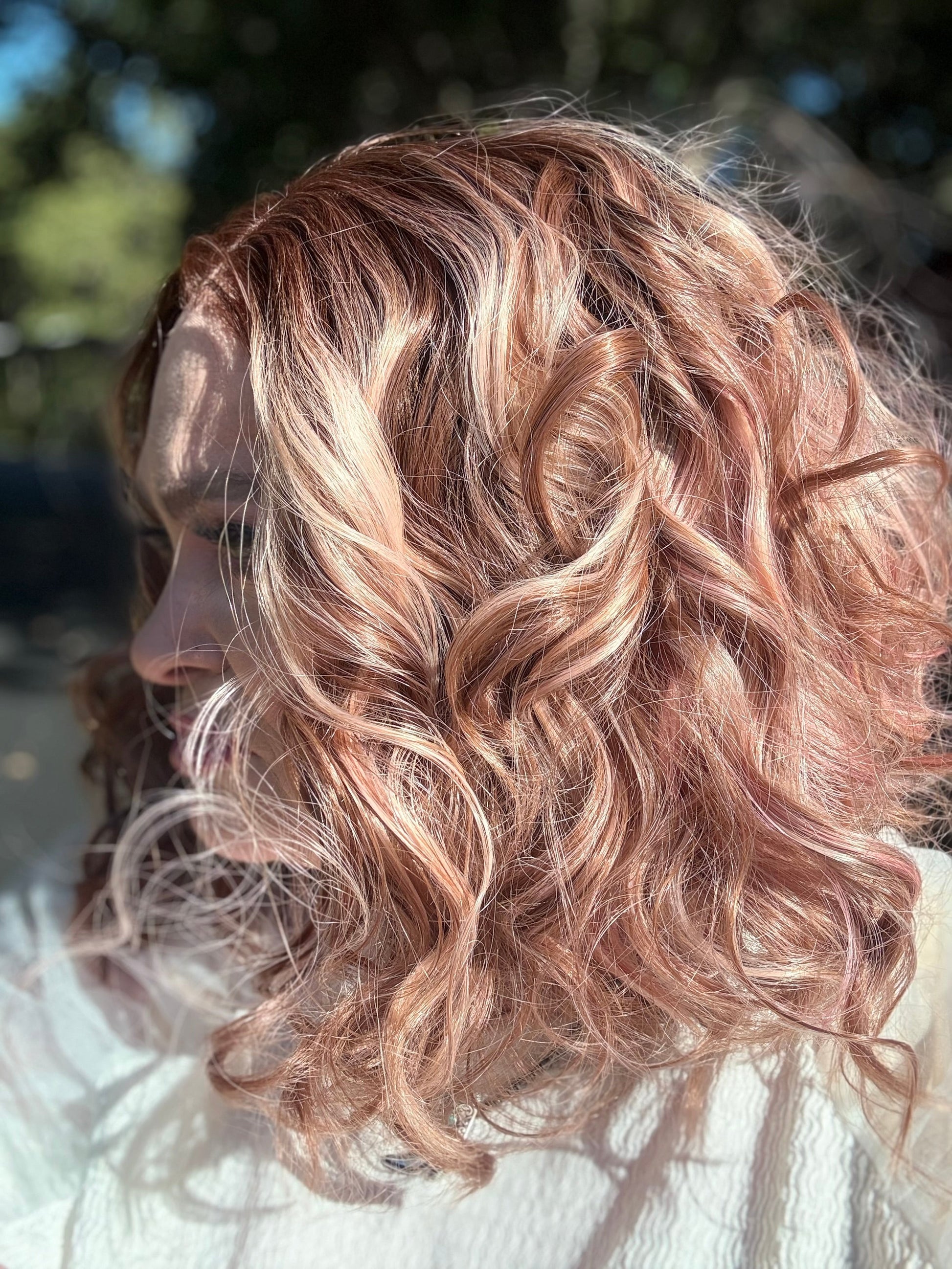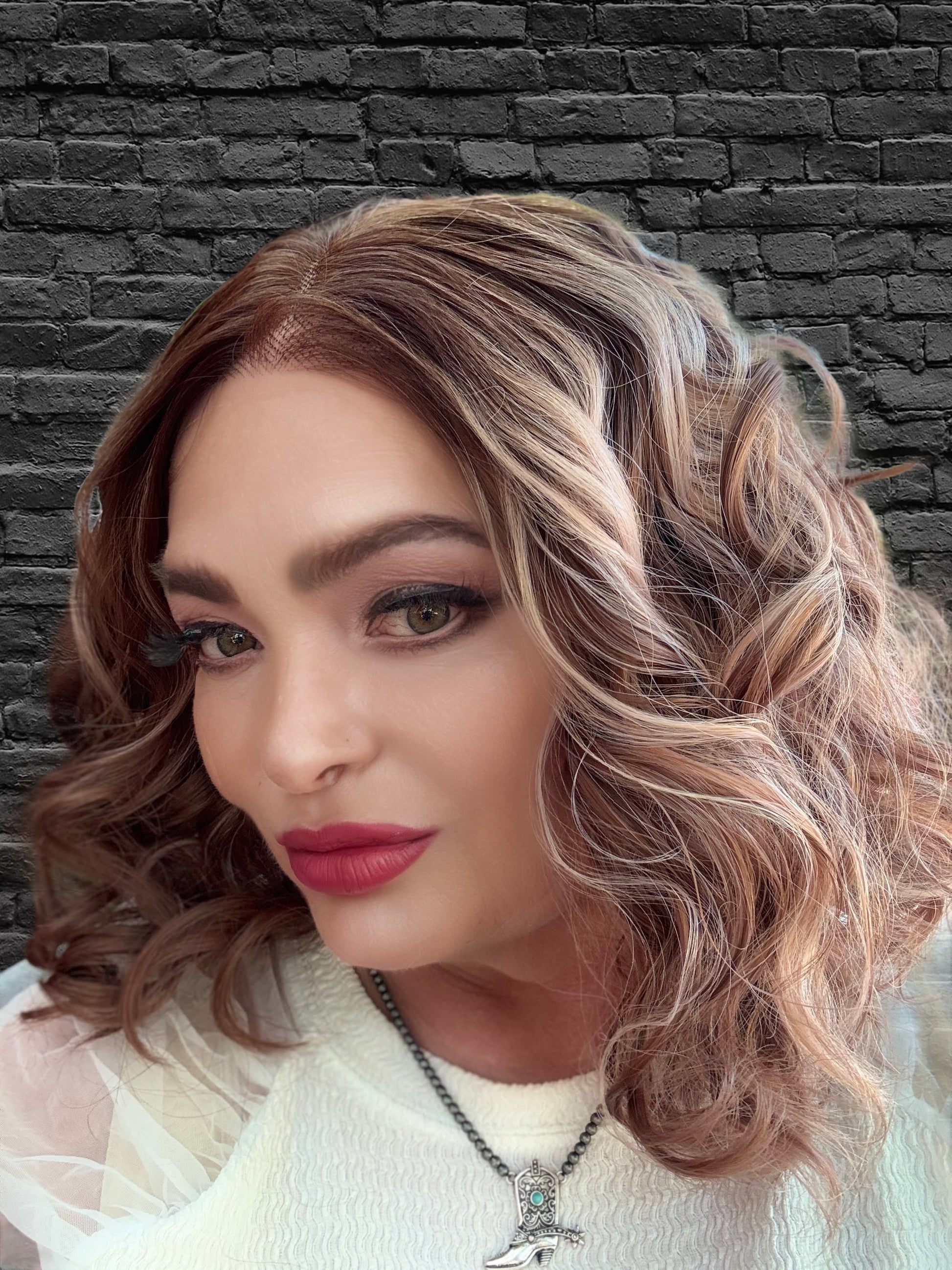 With stunning apricot coloring and plum low lights, SIESTA is a 14-inch synthetic lace front wig that features a free part and adjustable straps for a comfortable fit. Made with premium heat-resistant fibers, it offers versatile styling options for a natural look. Its loose curls and rooted design add extra volume and body.