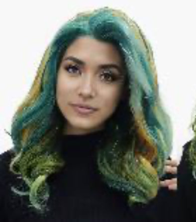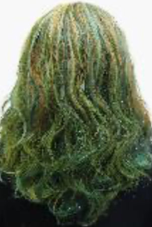 "Expertly crafted with a 13 x 2 lace front and adjustable straps, SPOOKY SPARKLE offers a precise, comfortable fit for standard to large cap sizes. Made with premium heat-resistant synthetic fibers and tinsel, this wig boasts a stunning mix of green, yellow, and brown for a unique, eye-catching look. The high density ensures a luxurious, natural appearance. Perfect for those who want to stand out in style. "