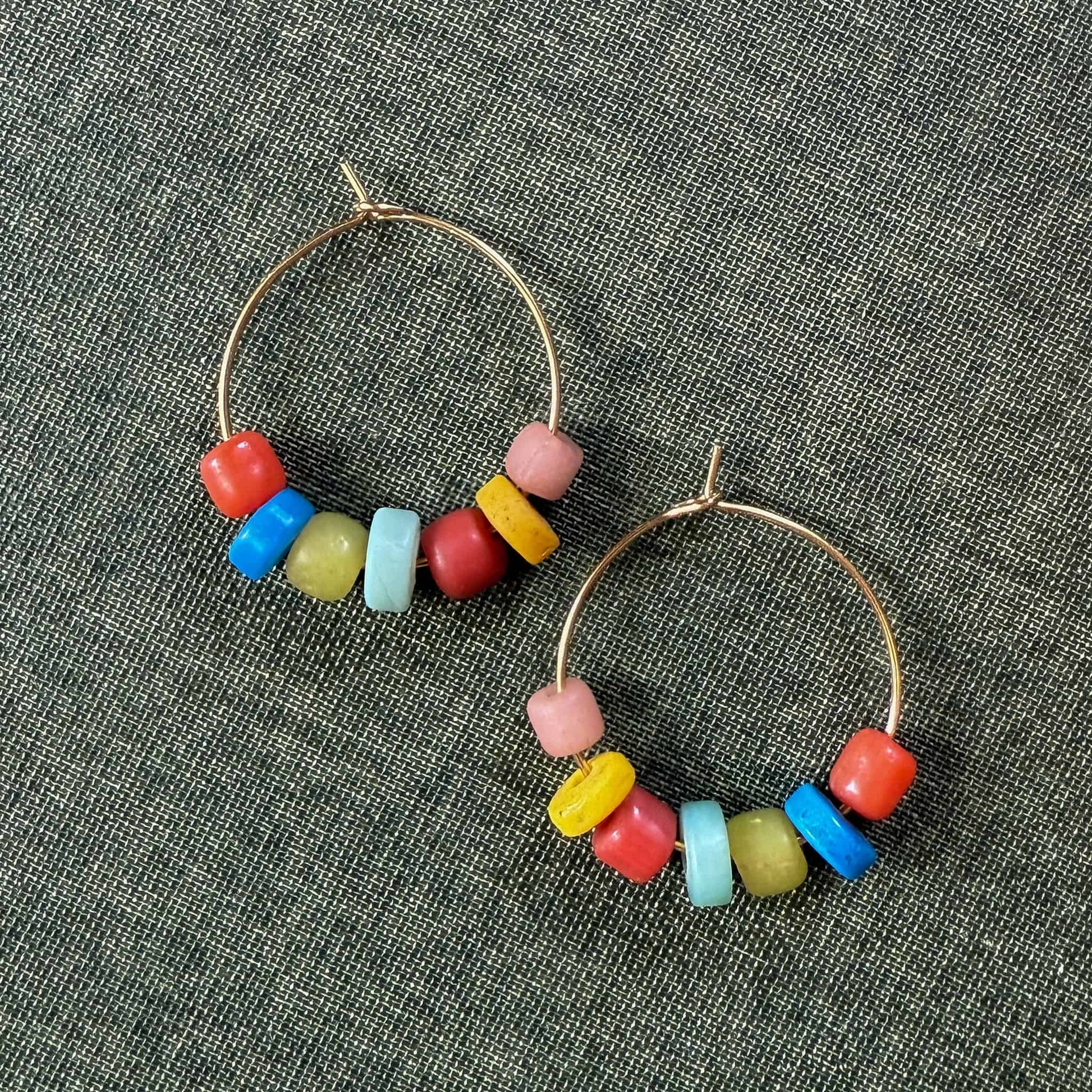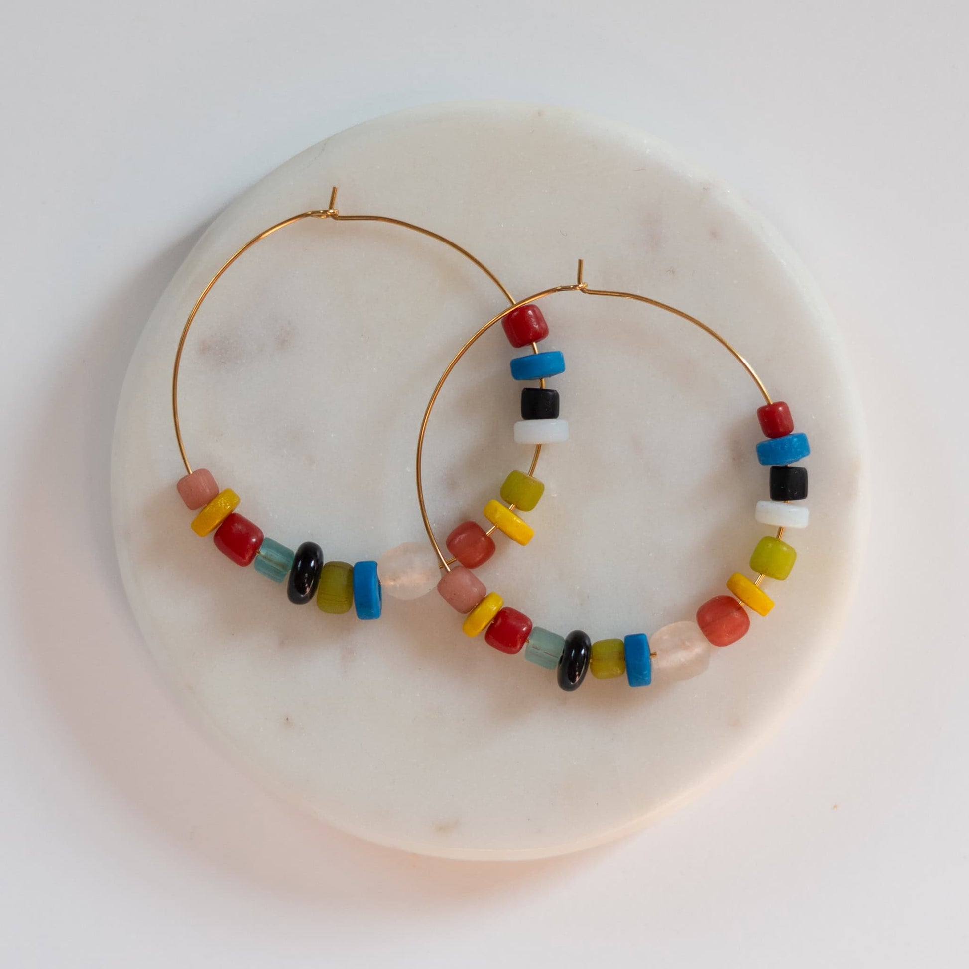These beaded hoops capture the warm golden tones of a sunrise, while also making a positive impact. Made with recycled Indonesian glass beads, each pair empowers women coming out of human trafficking with fair wage jobs. Shine bright and do good with these unique earrings!
